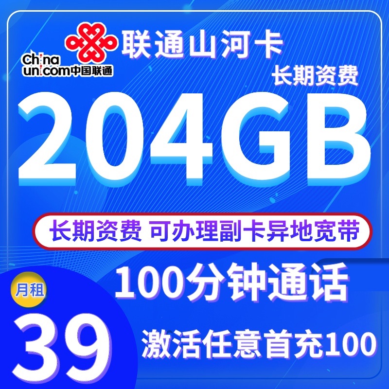 联通山河卡套餐介绍 激活一次性首充100享受优惠 首月扣全月月租,全量全价套餐资费1、39包204GB通用流量+100分钟通话,套 …