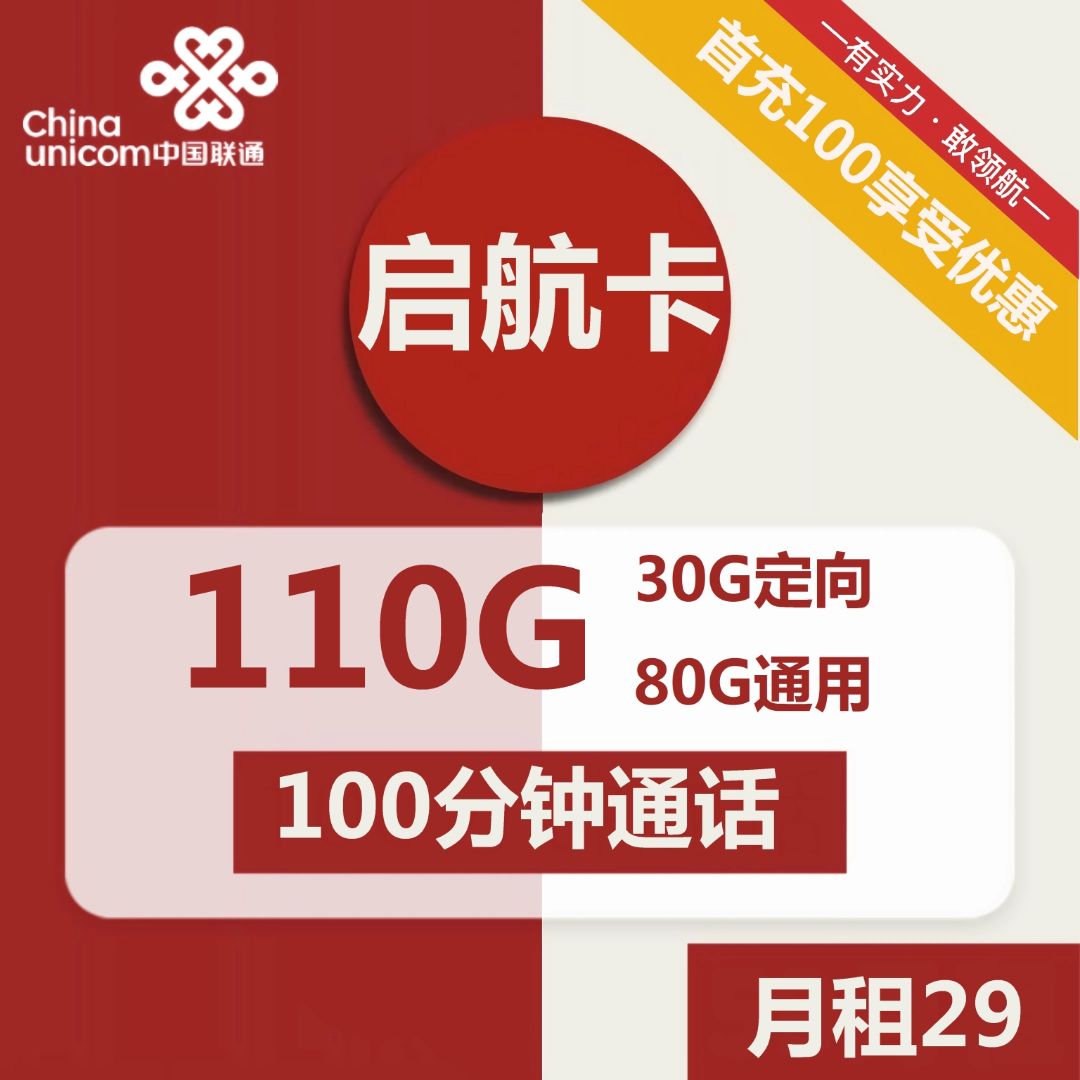 联通启航卡套餐介绍 资费详情 29元包80G通用+30G定向+100分钟通话+400条短信套餐外业务资费:国内语音拨打0.1元/分 …