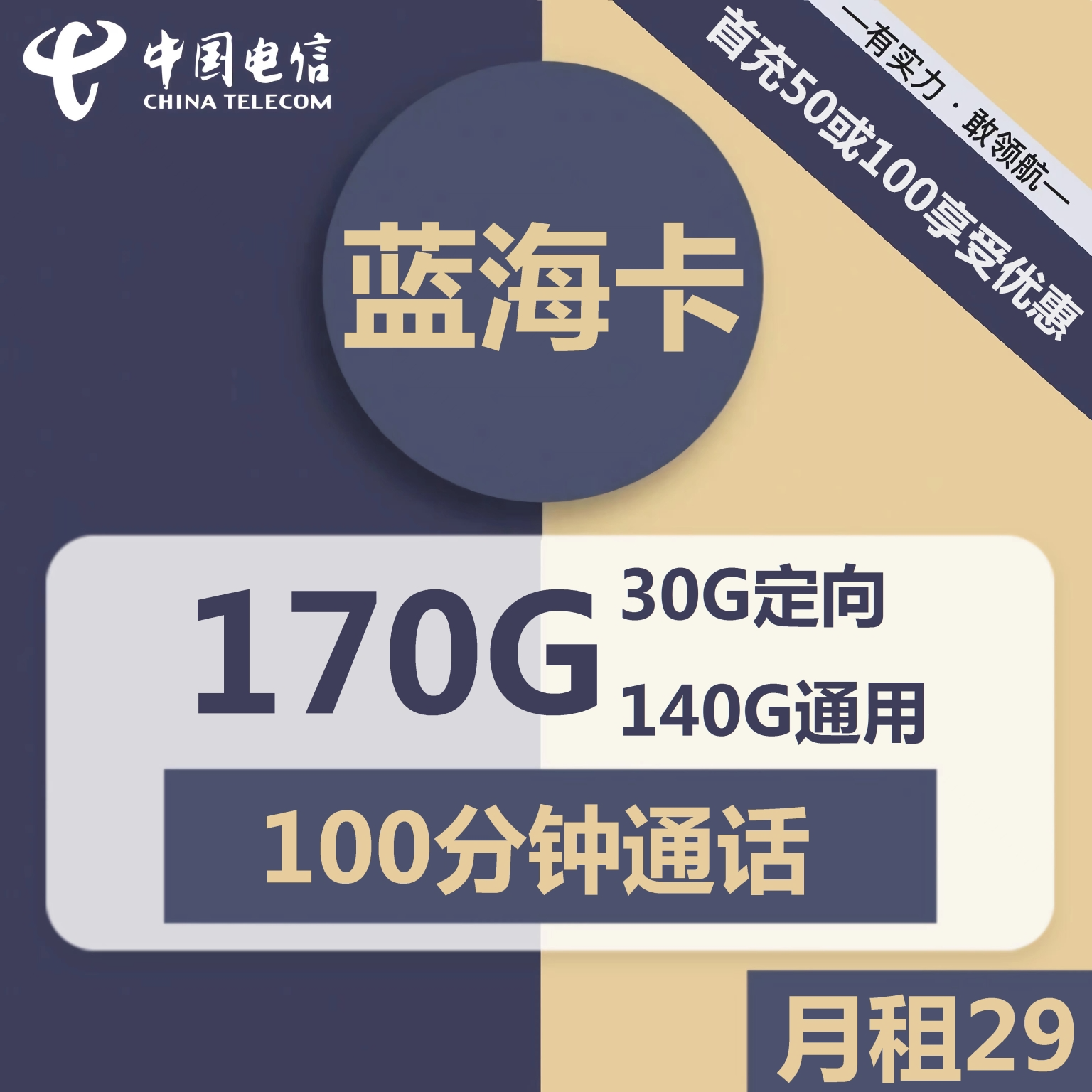 电信蓝海卡29元140G通用流量+30G定向流量+100分钟通话