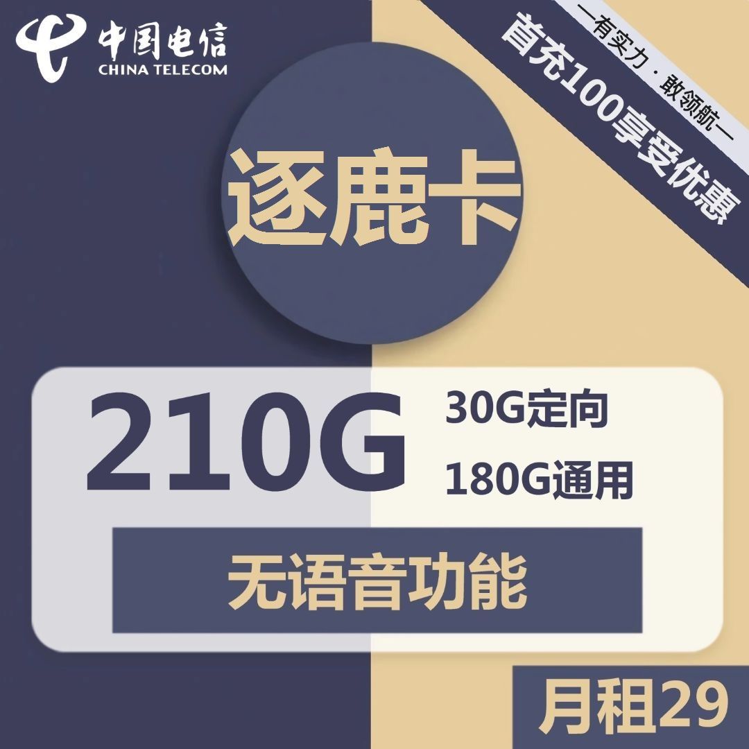 电信逐鹿卡29元包180G通用+30G定向+无语音功能