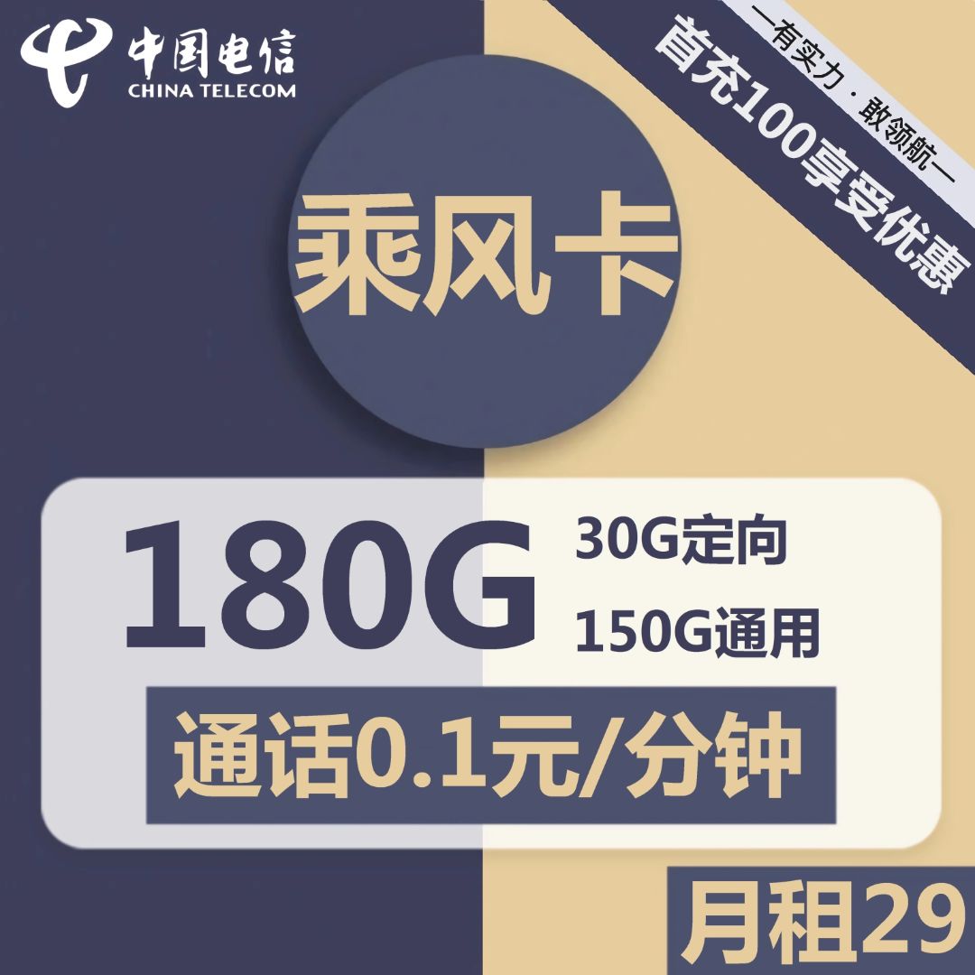 电信乘风卡套餐介绍 产品标题 电信乘风卡29元包150G通用+30G定向+通话0.1元/分钟 套餐归属 山东 配送方式 邮政为主 …