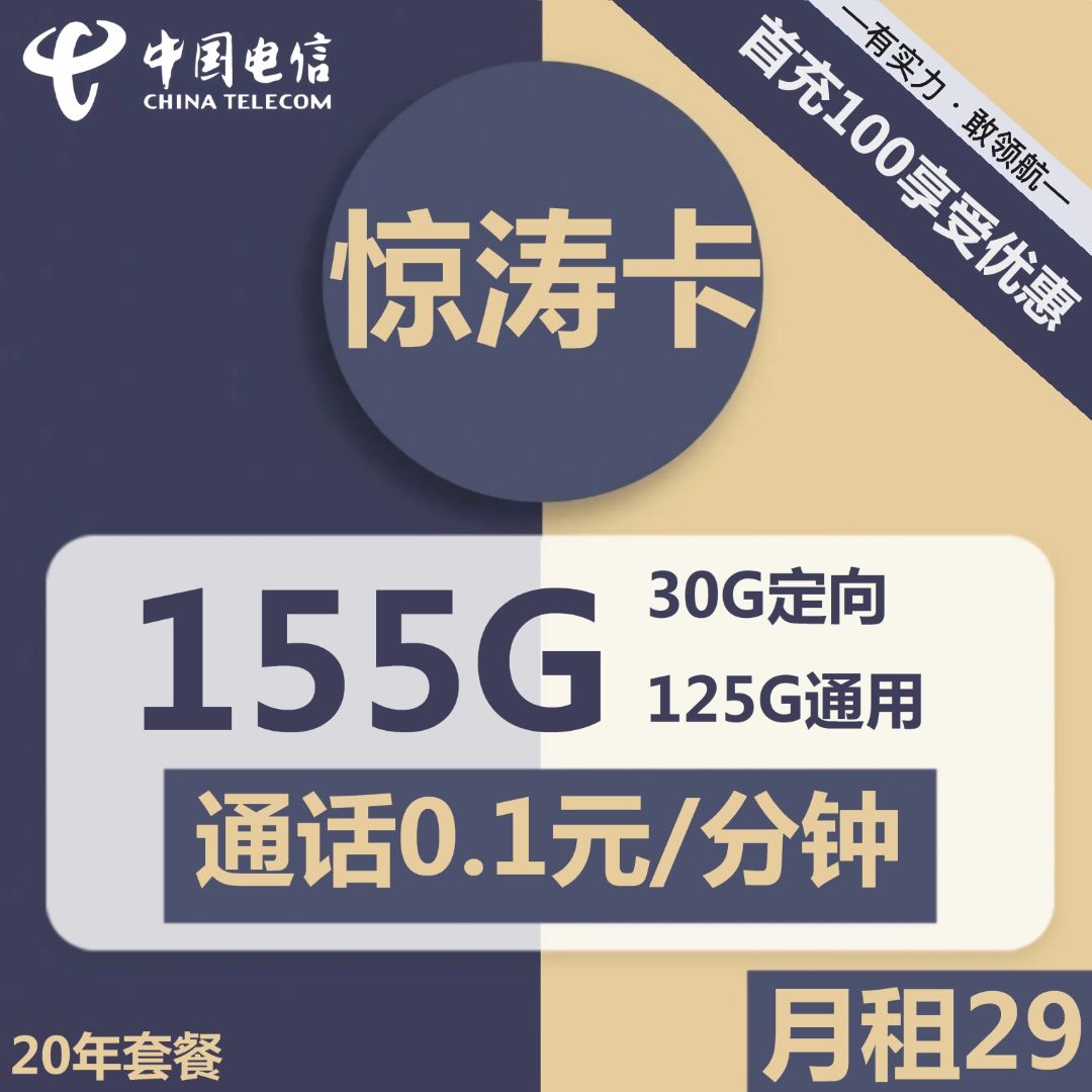 电信惊涛卡套餐介绍 产品标题 电信惊涛卡29元包125G通用+30G定向+通话0.1元/分钟 套餐归属 山东 配送方式 邮政为主 …