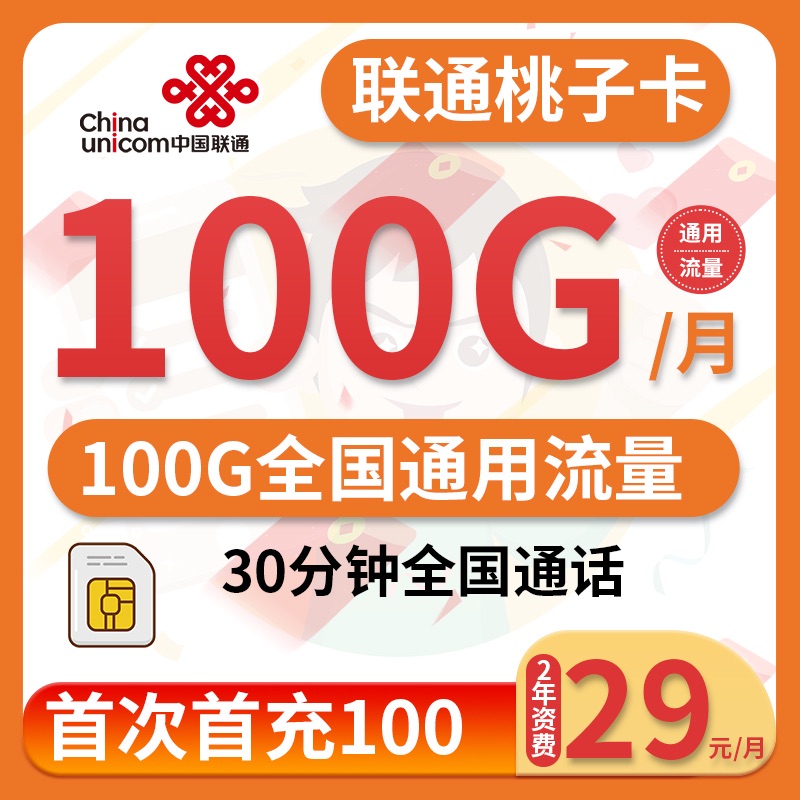 联通桃子卡29月租+100G通用流量+30分钟通话 套餐资费 首冲100话费后,享受:29元包100G通用流量+30分钟全国通话赠 …