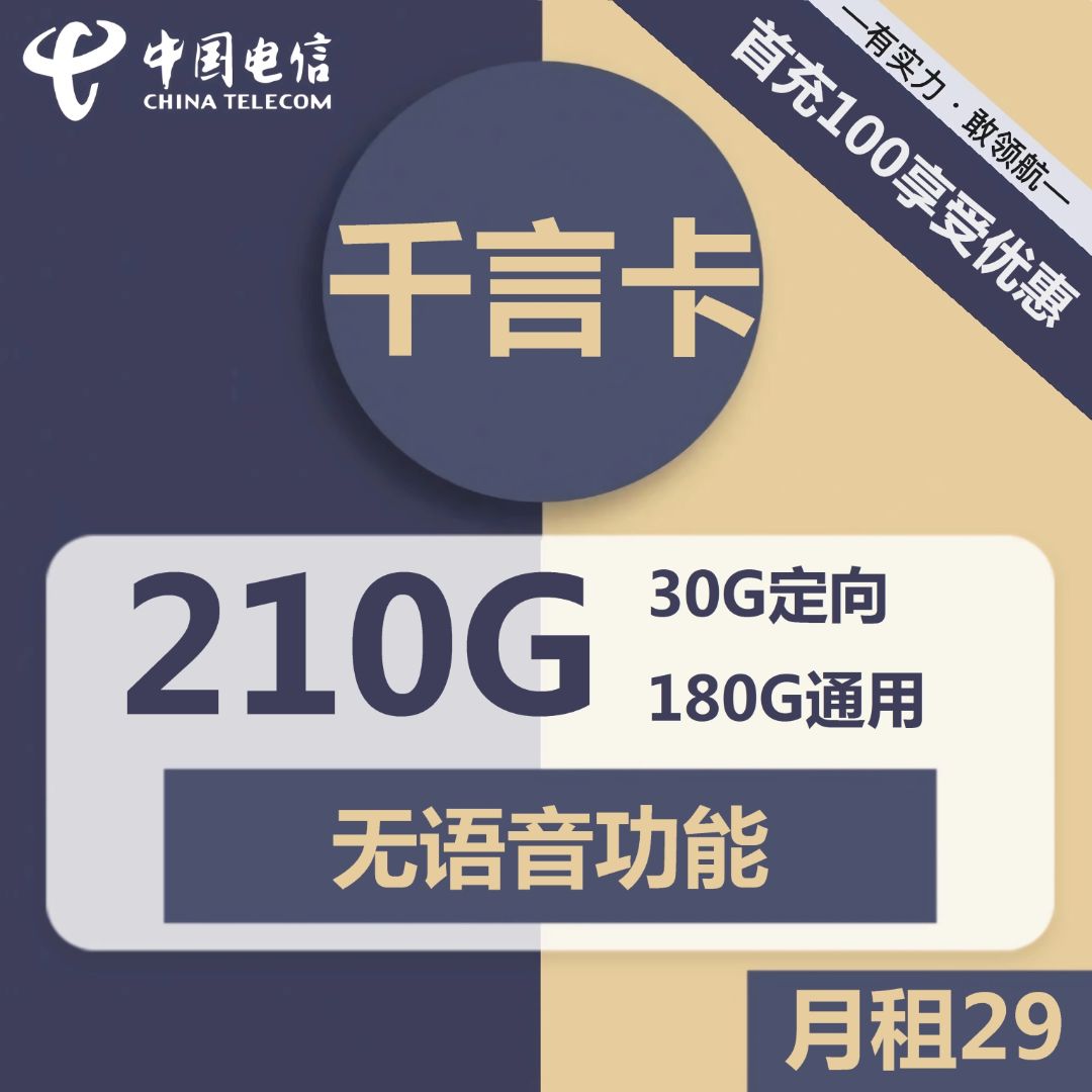 电信千言卡29元180G通用+30G定向+无语音功能 套餐构成 原月费59元包含30G定向+20G通用专属渠道充值100得220可 …