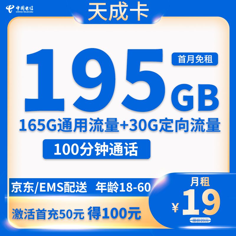 电信天成卡19元195G流量+100分钟通话 资费介绍 原套餐29元包30GB定向流量。国内流量:5元/G,短信/彩信: 0.1元 …