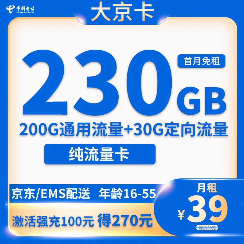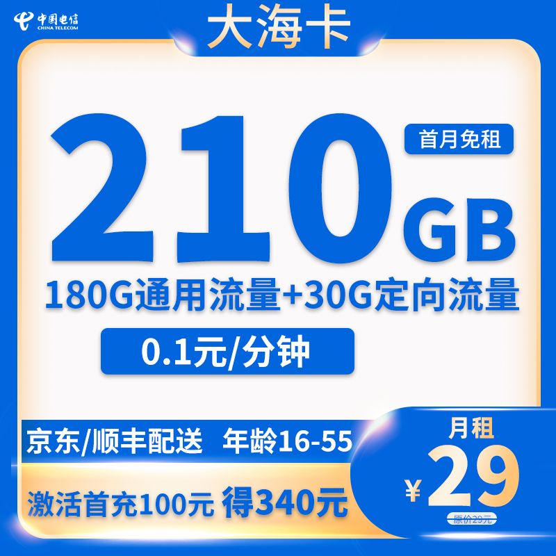电信大海卡29元210G流量+0.1分钟通话【长期套餐】