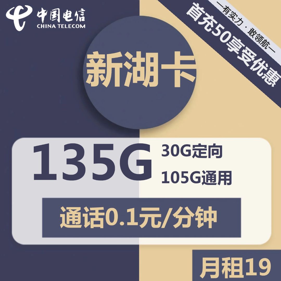 电信新湖卡通话0.1元/分钟流量105G通用+30G定向19元月租 套餐构成 原套餐29月租包30定向流量激活过程中任选充值50元 …