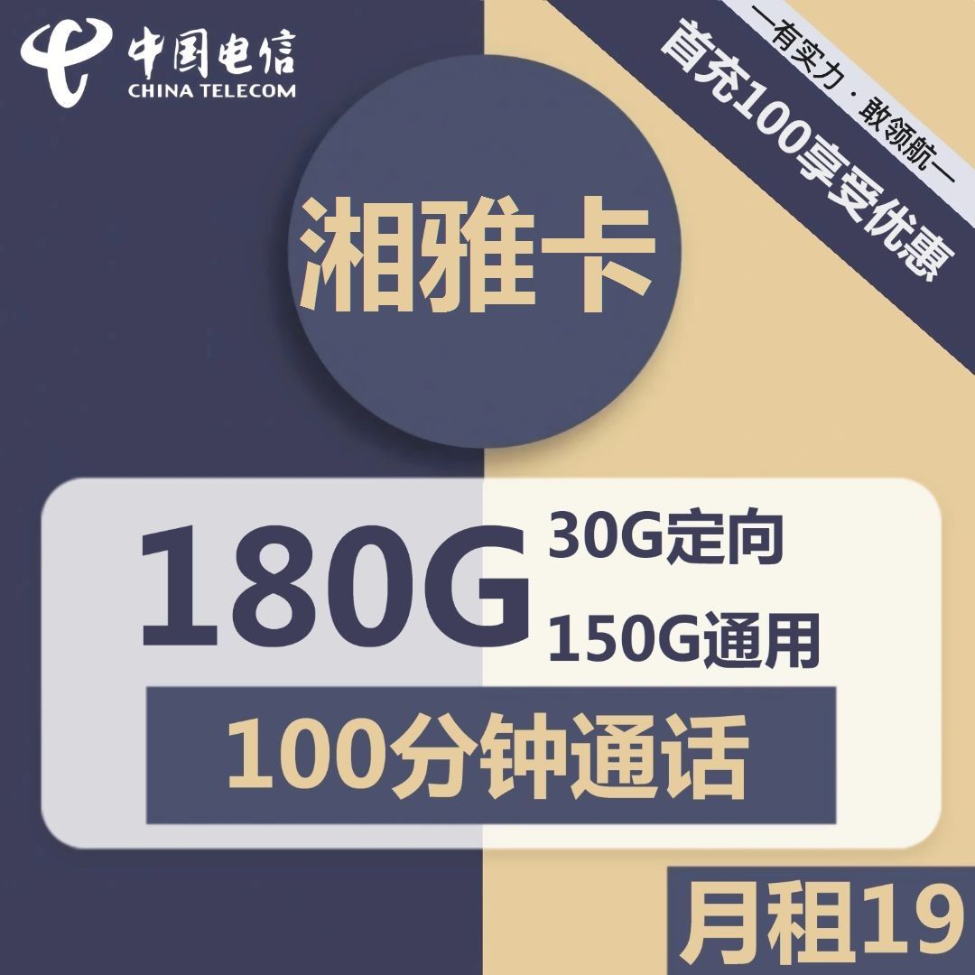 电信湘雅卡19元150G通用流量+30G定向流量+100分钟通话
