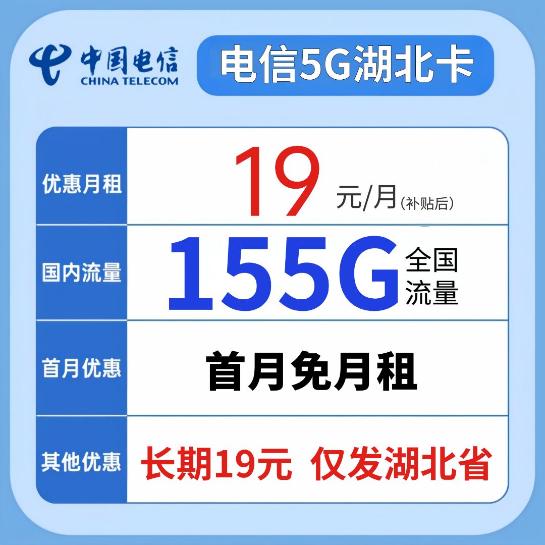 湖北电信星卡19元155G全国流量+0.1分钟通话【只发湖北省内】
