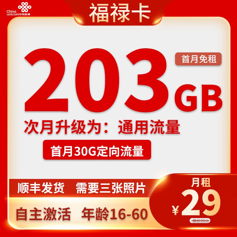 联通福禄卡29元203G通用流量+0.15分钟通话【需要上传照片】 资费介绍 原套餐29元包30G定向流量,次月起升级为29元包2 …