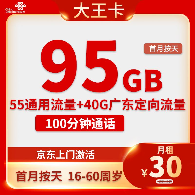 联通大王卡30元95G流量+100分钟 资费介绍 原套餐39元包30G通用流量+40G广东省内定向流量+100分钟通话国内流量: …
