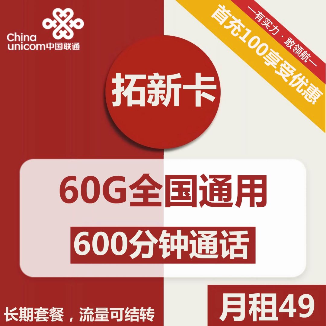 联通拓新卡49元60G通用+600分钟通话(流量可转结) 套餐优惠内容及注意事项 原月租49元/月包含600分钟全国通话+60G全 …