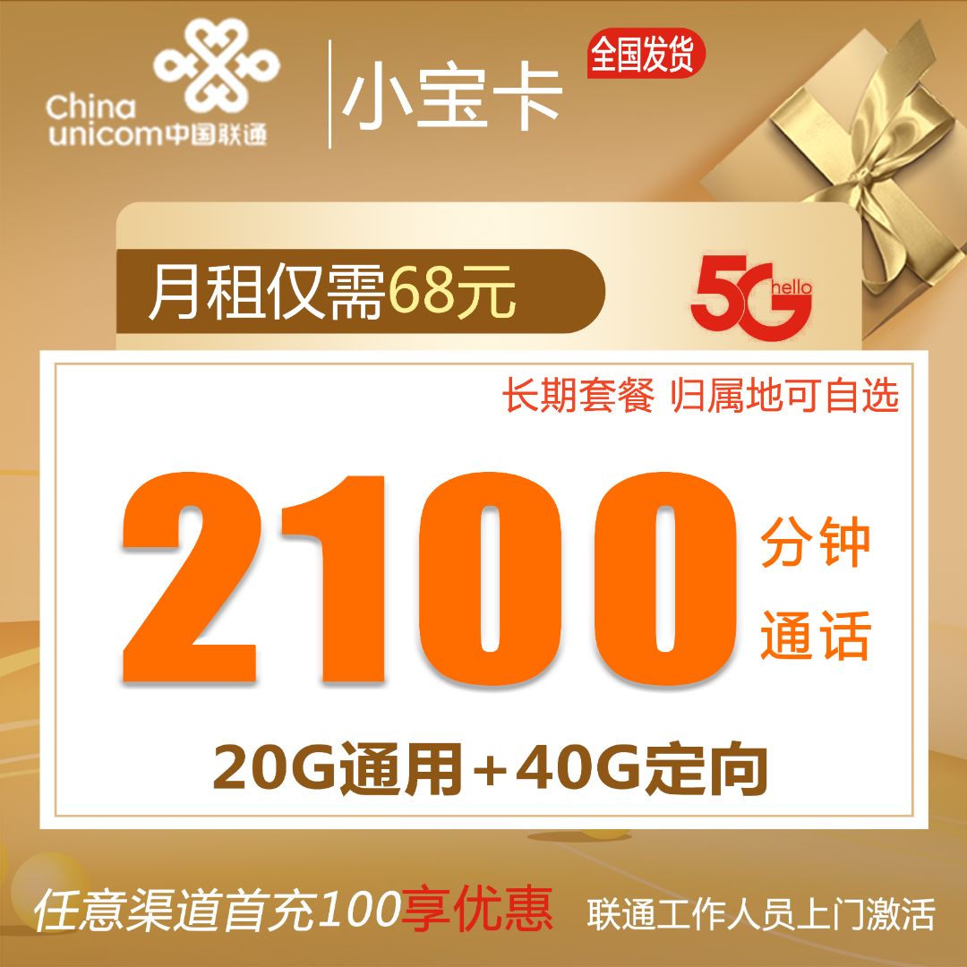 联通小宝卡月费68元国内流量60GB国内语音2100分钟通话任意渠道首充100元享以下优惠(联通当地工作人员上门激活) 资费介绍 …