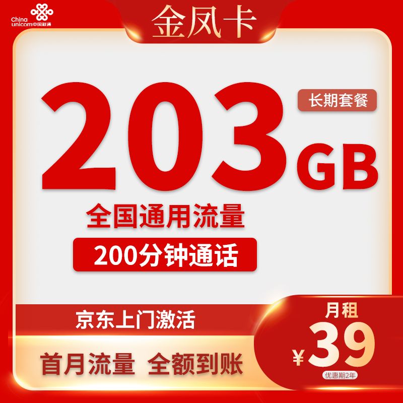 联通金凤卡月租39元/月(原月租39元/月)全国流量203G全国通用流量通话200分钟优惠期2年到期可续 资费介绍 原套餐39元包 …
