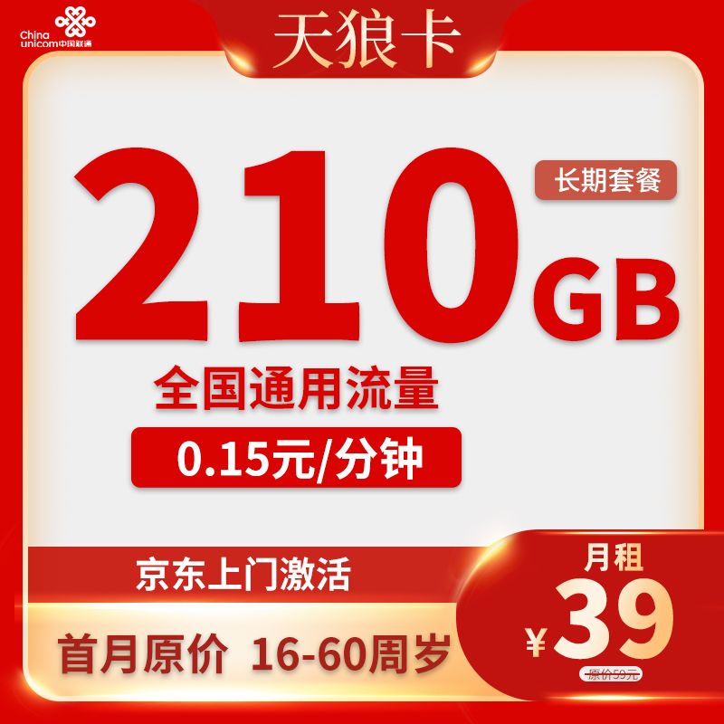 联通天狼卡月租39元/月(原套餐59元/月)全国流量210G全国通用流量首月原价优惠期2年 资费介绍 原套餐59元包10G通用流量 …