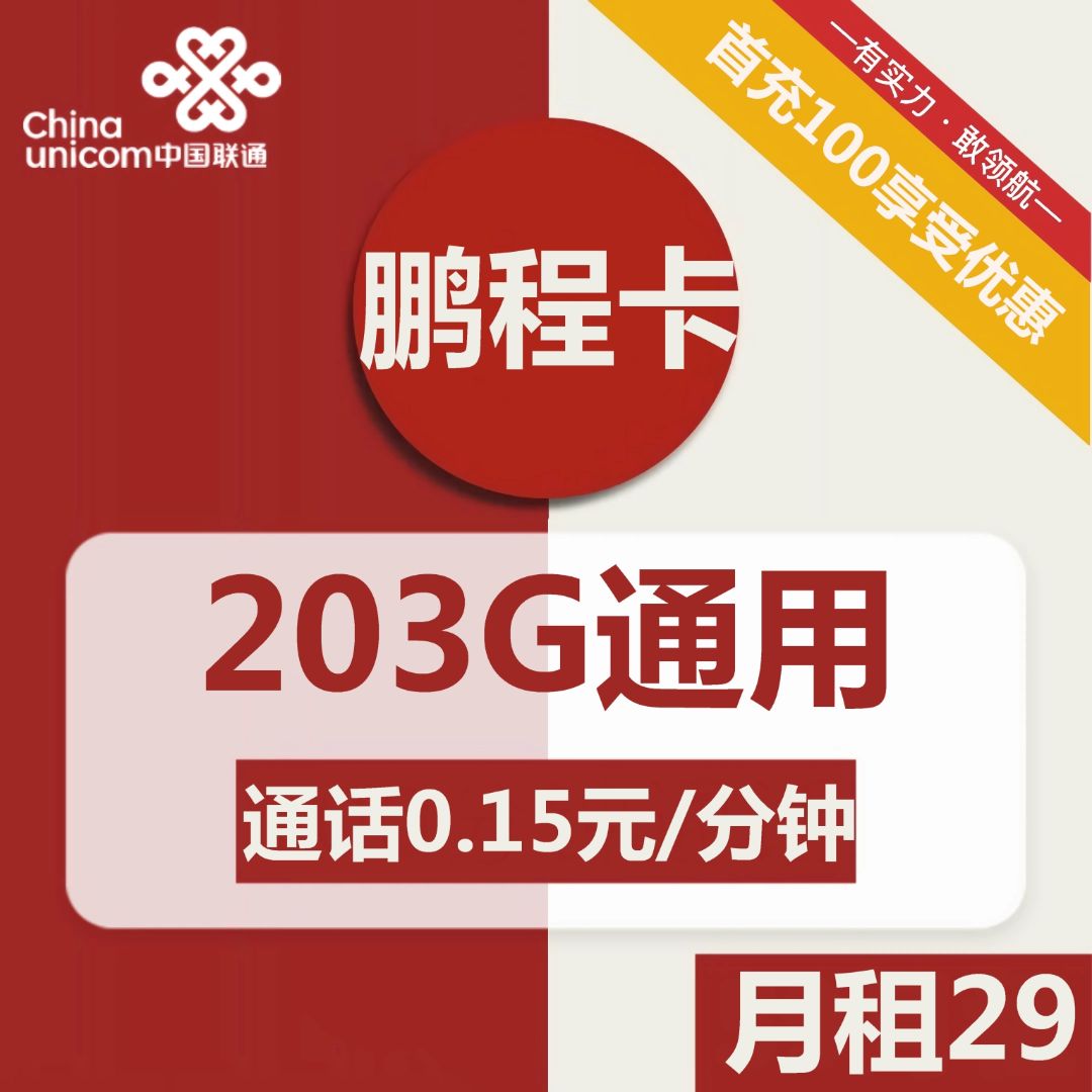 联通鹏程卡29元包203G通用+通话0.15元/分钟