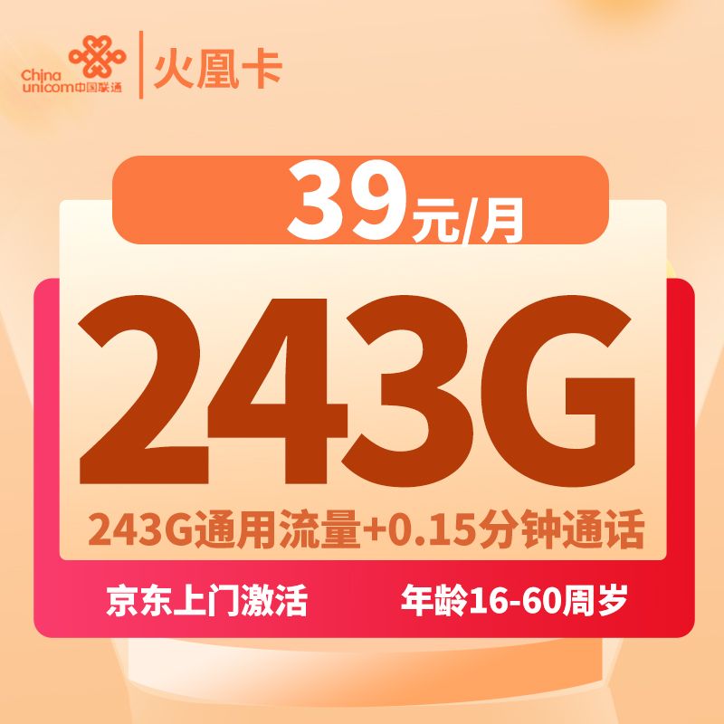 联通火凰卡月享243G流量活动期:39元/月月享243GB通用流量243G通用+0.15分钟通话京东上门激活首月全价全量任意渠道首 …
