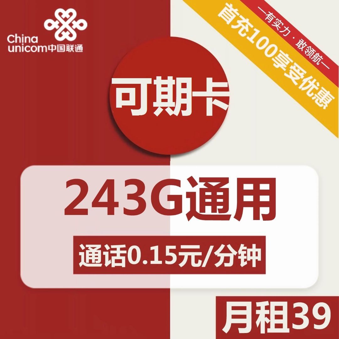 联通可期卡39月租租243G通用通话0.15/分钟 套餐优惠内容及注意事项 原套餐: 59元包50GB全国通用流量套餐外流量5元/ …